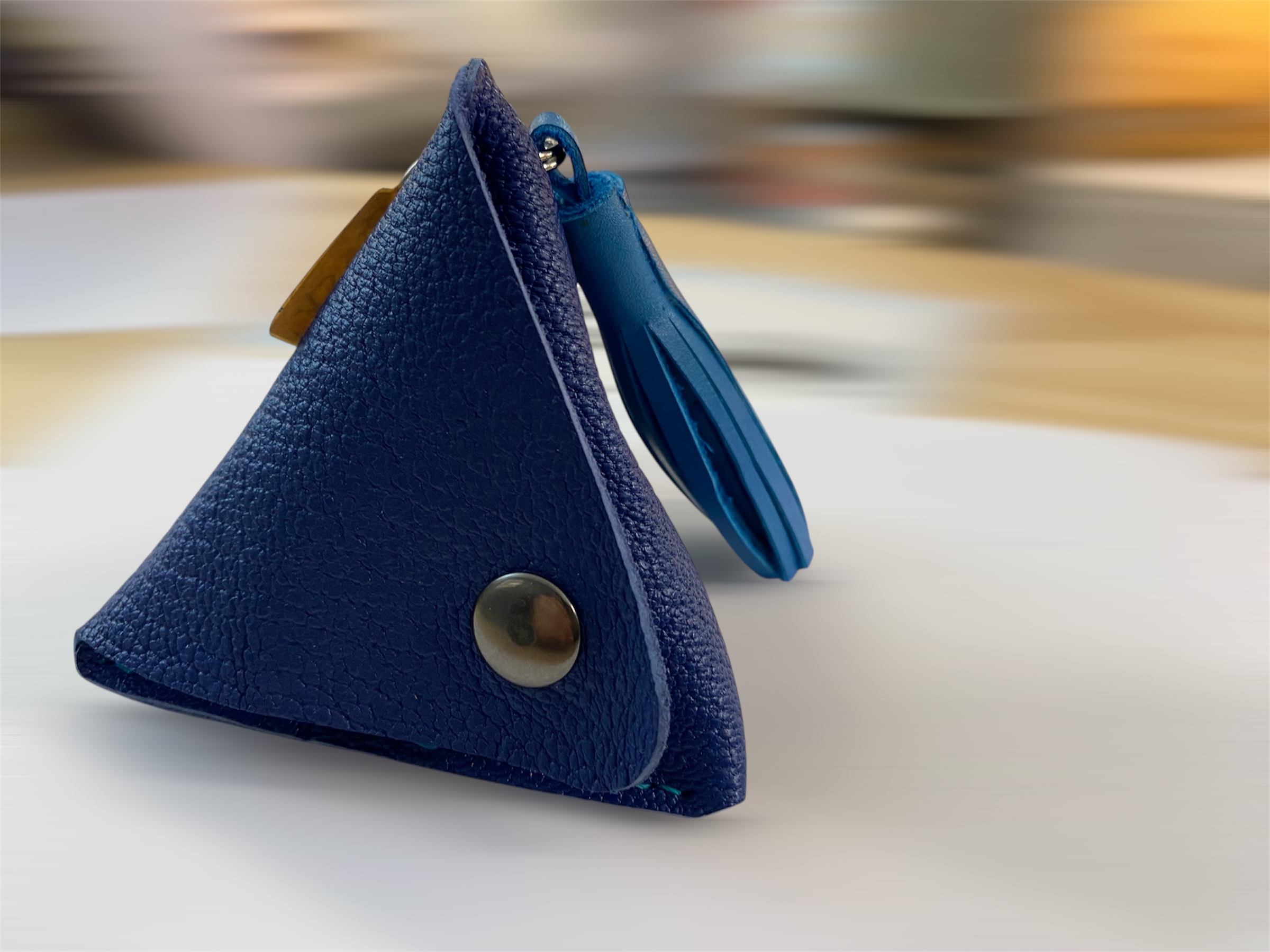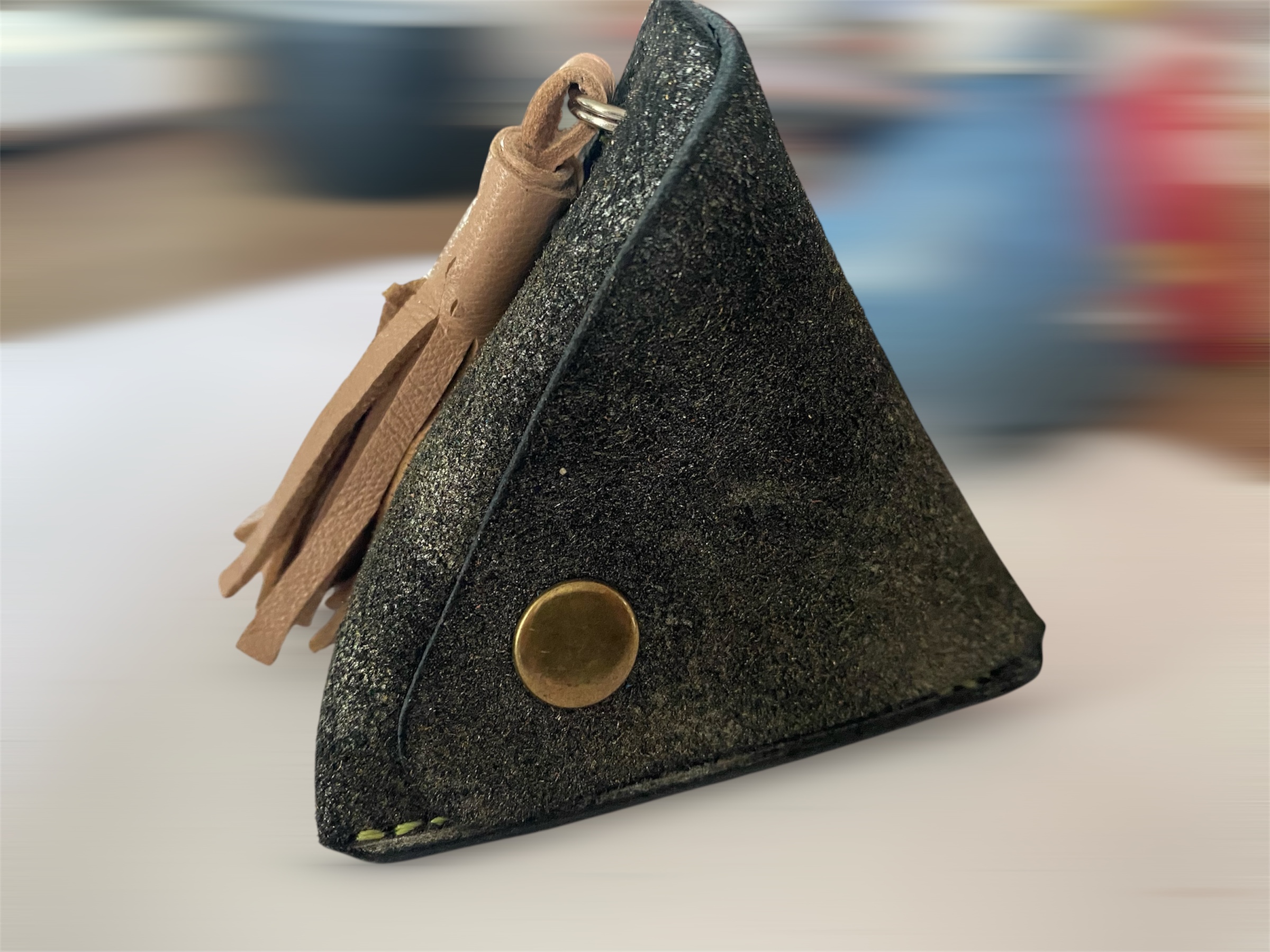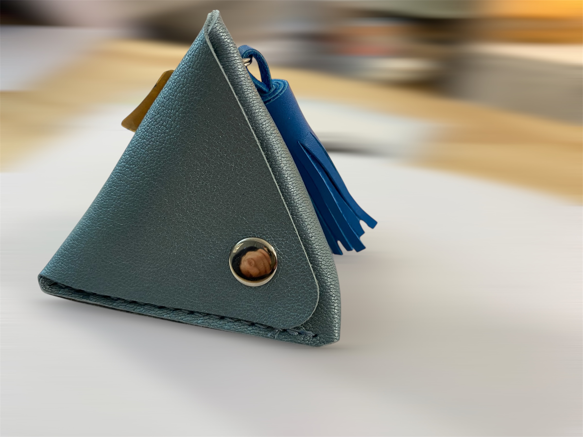 Triangle 3D ou Pyramide en cuir souple de veau ou de chèvre suivant l’ arrivage de cuir.