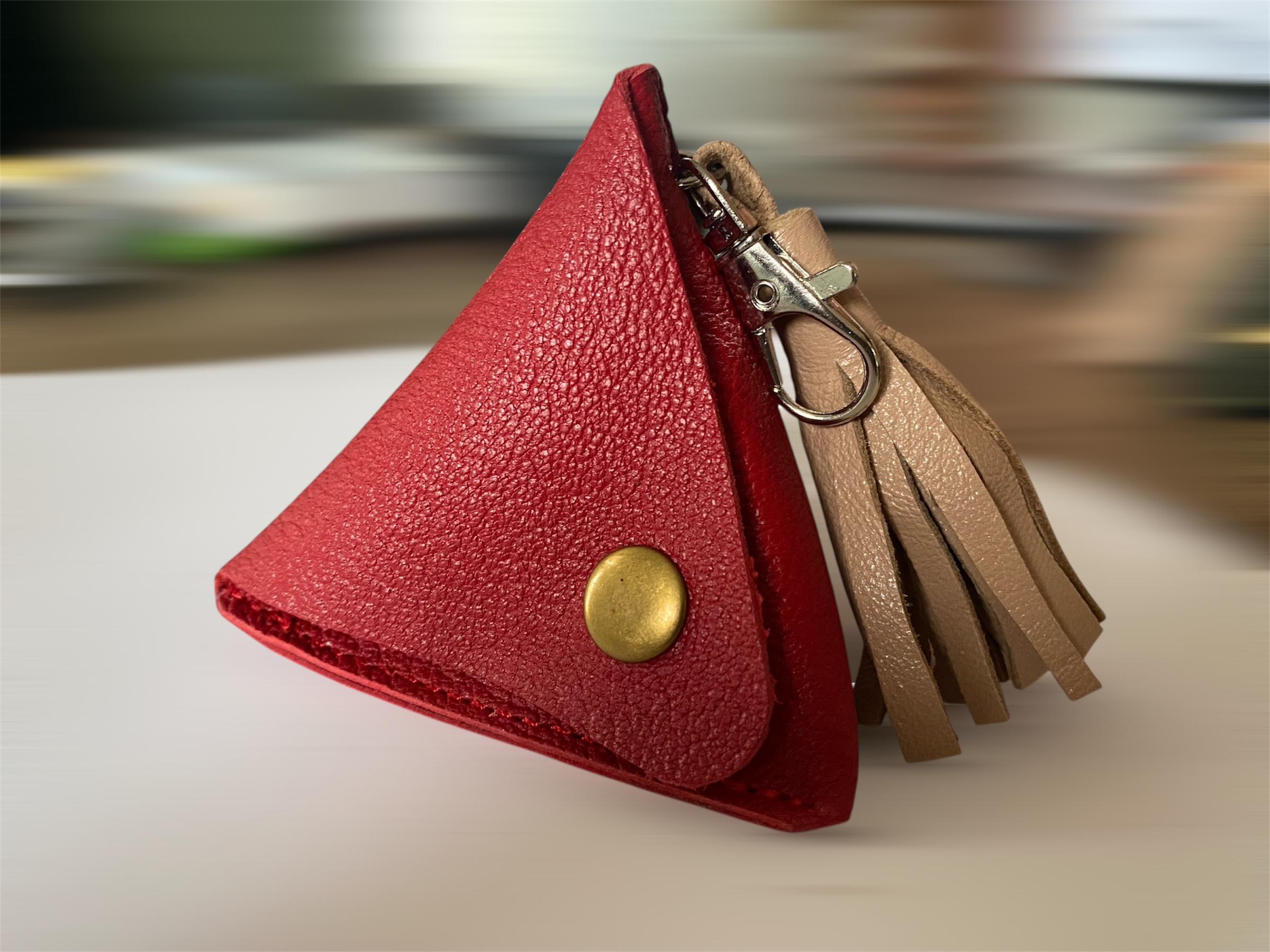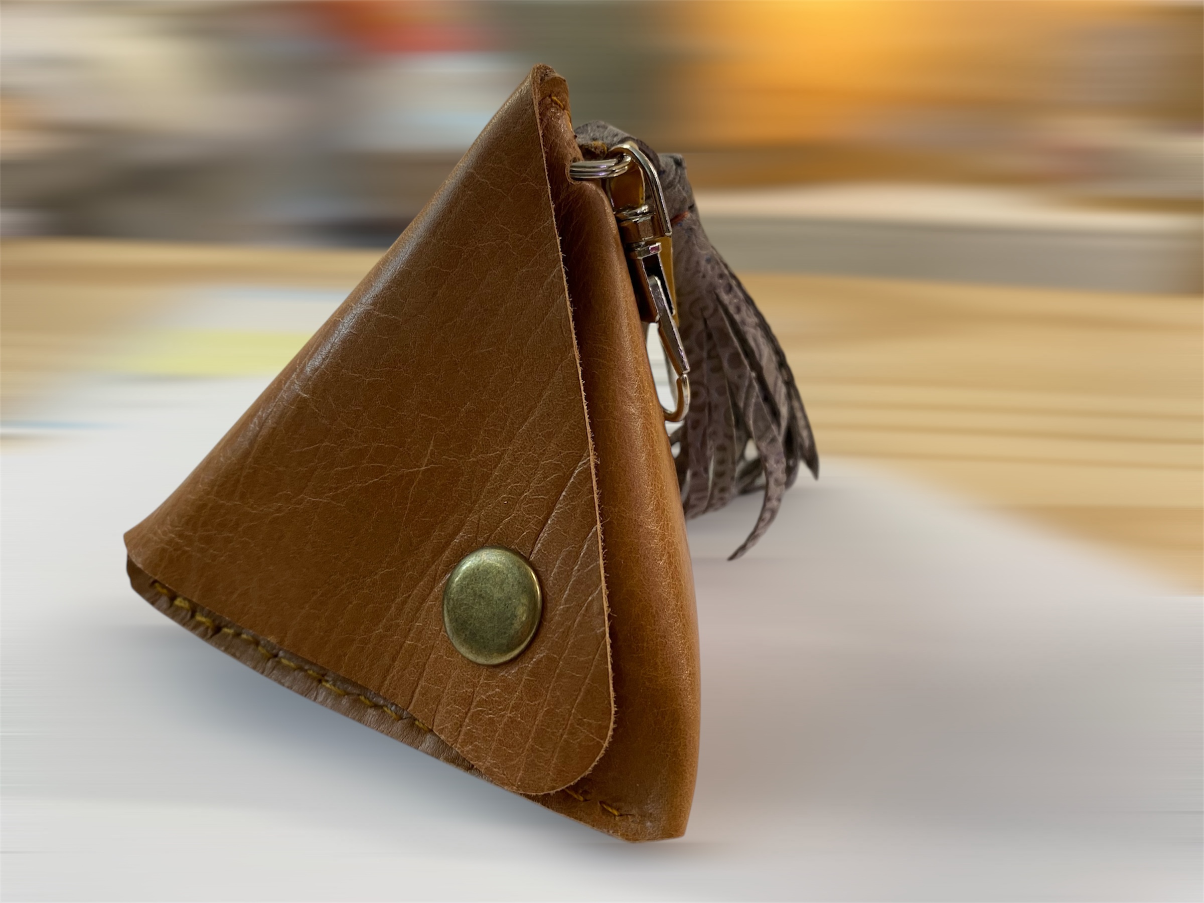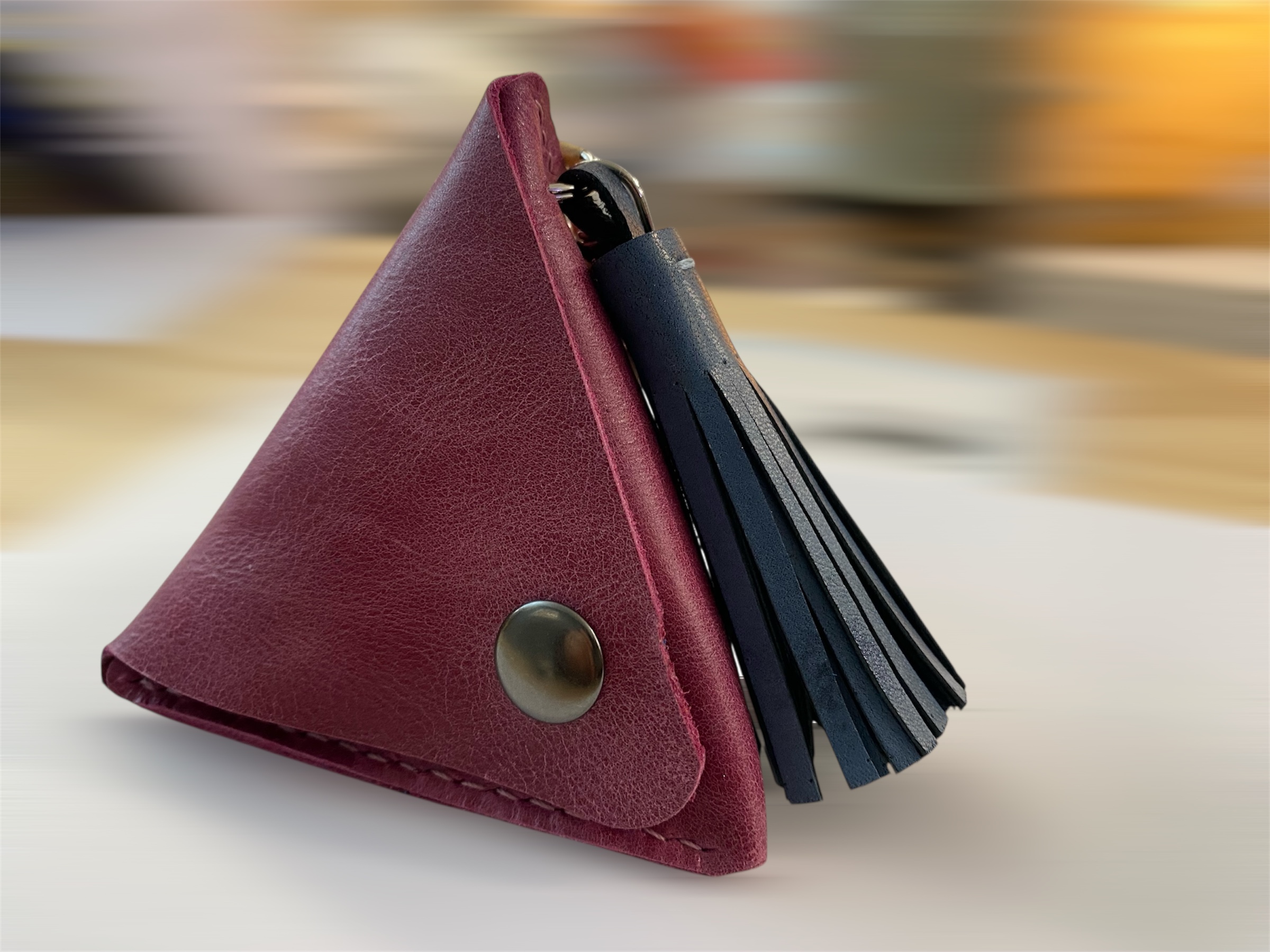 Triangle 3D ou Pyramide en cuir souple de veau ou de chèvre suivant l’ arrivage de cuir.
